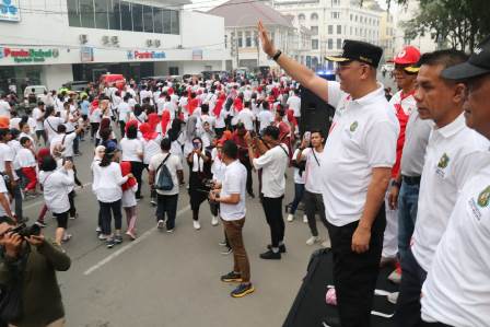 MEDAN, Eksisnews.com – Wali Kota Medan Drs H T Dzulmi Eldin S MSi MH melepas peserta Fun Walk (jalan santai) di Jalan Pulau Pinang Medan, Minggu (22/9). Kegiatan olahraga yang digelar Pemko Medan melalui Dinas Perhubungan (Dishub) Kota Medan ini dalam rangka memperingati Hari Perhubungan Nasional (Harhubnas) yang jatuh pada 17 September lalu. Selain seluruh pegawai Dishub, ribuan warga juga turut serta dalam kegiatan tersebut. Apalagi sejumlah hadiah menarik telah dipersiapkan lewat undian lucky draw.