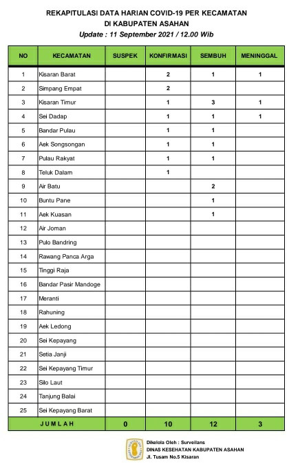 Lebih lanjut dikatakannya dimana untuk data hari ini Kecamatan Kisaran Barat mendominasi Konfirmasi tertinggi sebanyak 2 orang disusul warga Kecamatan Simpang Empat sebanyak 2 orang. Dayat juga menyampaikan dimana data sebelumnya pada tanggal 10 September 2021 Rekapitulasi Harian Covid–19 per Kecamatan di Asahan dengan jumlah warga Asahan yang Konfirmas sebanyak 25 orang 22 orang dinyatakan Sembuh dan 2 orang Meninggal dunia akibat Covid.