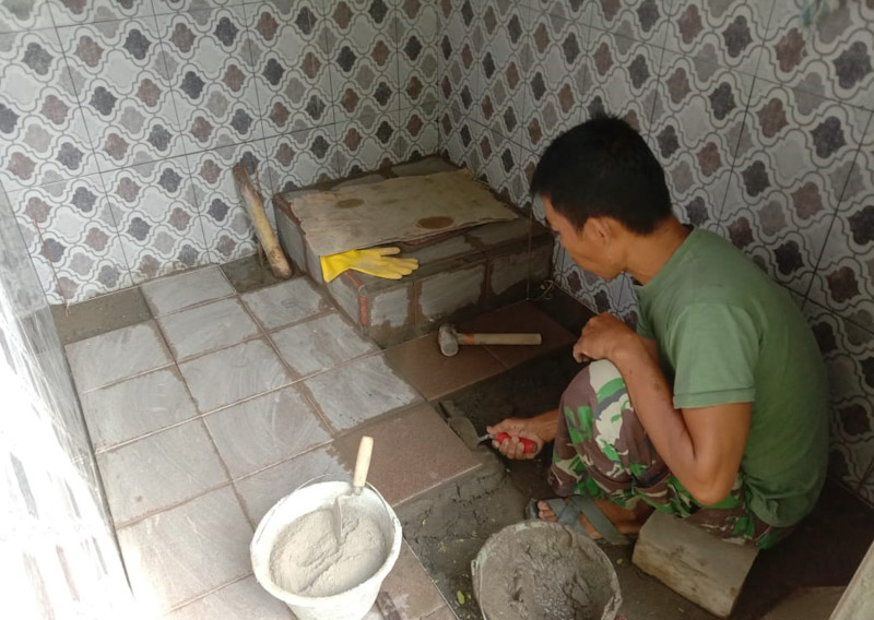 Memasuki hari ke-17 dilaksanakannya Pra TMMD personel Kodim 0203/Langkat melanjutkan pekerjaan pemasangan keramik lantai kamar mandi dan pengisian nat keramik lantai kamar mandi.