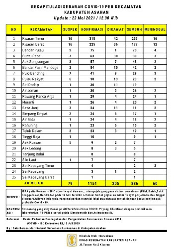 Demikian Data Update tersebut disampaikan Juru Bicara Satuan Tugas Percepatan Penanganan Covid – 19 Kabupaten Asahan H. Rahmat Hidayat Siregar S. Sos. M.Si, Sabtu (22/05/2021) berdasarkan hasil data surveilans dari seluruh Puskesmas yang ada di wilayah Kabupaten Asahan sebagaimana di kelola Dinas Kesehatan Kabupaten Asahan pertanggal 22 Mei 2021 hingga pukul 12.00 Wib.