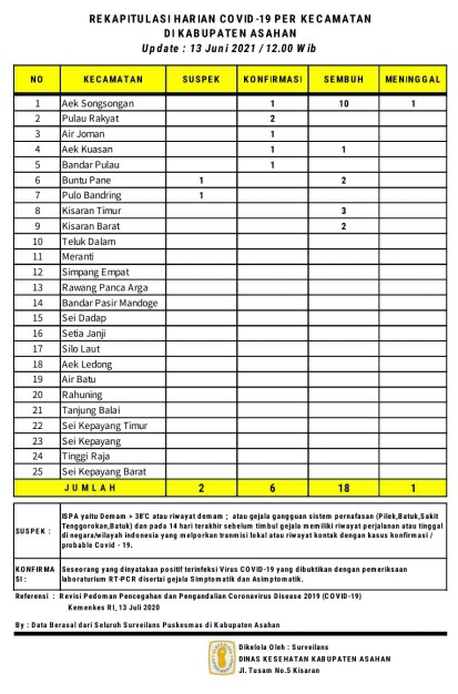 EKSISNEWS.COM, Kisaran – Rekapitulasi Harian Covid – 19 per Kecamatan untuk hari ini sebagaimana data surveilans dari seluruh Puskesmas yang ada di wilayah Kabupaten Asahan yang di kelola Dinas Kesehatan Kabupaten Asahan tanggal 13 Juni 2021 pukul 12.00 Wib ada 2 warga Asahan suspek, 6 Konfirmasi, 18 Sembuh dan 1 meninggal dunia akibat Covid – 19.