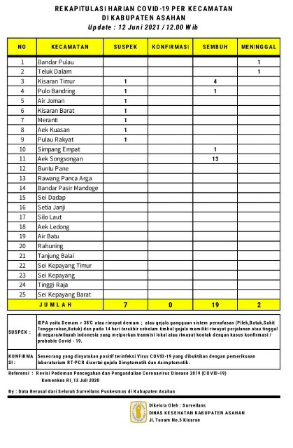 EKSISNEWS.COM, Kisaran – Rekapitulasi Harian Covid – 19 per Kecamatan untuk hari ini sebagaimana data surveilans dari seluruh Puskesmas yang ada di wilayah Kabupaten Asahan yang di kelola Dinas Kesehatan Kabupaten Asahan tanggal 12 Juni 2021 pukul 12.00 Wib ada 7 warga Asahan suspek, Sembuh 19 dan 2 meninggal dunia akibat Covid – 19.