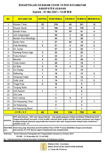 Demikian Data Update tersebut disampaikan Juru Bicara Satuan Tugas Percepatan Penanganan Covid – 19 Kabupaten Asahan H. Rahmat Hidayat Siregar S. Sos. M.Si, Sabtu (01/05/2021) berdasarkan hasil data surveilans dari seluruh Puskesmas yang ada di wilayah Kabupaten Asahan sebagaimana di kelola Dinas Kesehatan Kabupaten Asahan pertanggal 01 Mei 2021 hingga pukul 12.00 Wib.