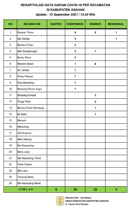 “Untuk Data hari ini akibat Covid – 19 warga Asahan yang Konfirmas sebanyak 25 orang 22 orang dinyatakan Sembuh dan 2 orang Meninggal dunia adapun jumlah warga yang Konfirmasi tertinggi dari Kecamatan Kisaran Timur mendominasi Konfirmasi tertinggi sebanyak 6 orang disusul warga Kecamatan Sei Dadap sebanyak 4 orang. Sebagaimana data dari Dinas Kesehatan Kabupaten Asahan tersebut, warga yang terpapar Covid-19 untuk hari ini ada di 10 Kecamatan dari 25 Kecamatan di Kabupaten Asahan.
