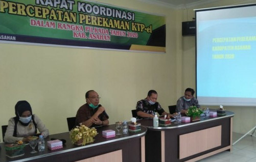 EKSISNEWS.COM, Kisaran – Pemerintah Kabupaten (Pemkab) Asahan melalui Dinas Kependudukan dan Pencatatan Sipil Kabupaten Asahan bersama Komisi Pemilihan Umum dan Bawaslu melakukan Rapat Koordinasi (Rakor) Percepatan Perekaman Kartu Tanda Penduduk Elektronik (KTP-EL) dalam rangka Pemilihan Kepala Daerah (Pilkada)Serentak 2020 Kabupaten Asahan, Kamis (03/12/2020), di Aula Kantor Disdukcapil Asahan.