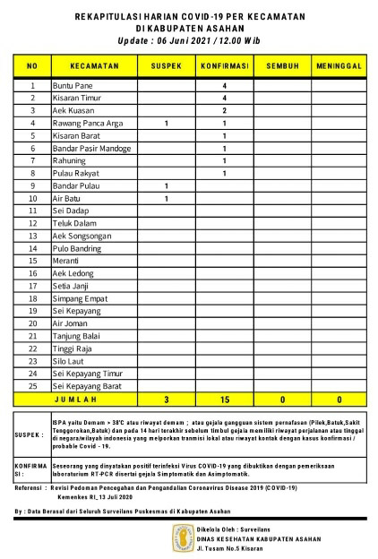 EKSISNEWS.COM, Kisaran – Rekapitulasi Harian Covid – 19 per Kecamatan untuk hari ini sebagaimana data surveilans dari seluruh Puskesmas yang ada di wilayah Kabupaten Asahan yang di kelola Dinas Kesehatan Kabupaten Asahan tanggal 06 Juni 2021 pukul 12.00 Wib ada 3 warga Asahan suspek dan 15 konfirmasi akibat dari Covid – 19.