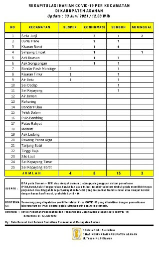 EKSISNEWS.COM, Kisaran – Rekapitulasi Harian Covid – 19 per Kecamatan untuk hari ini sebagaimana data surveilans dari seluruh Puskesmas yang ada di wilayah Kabupaten Asahan yang di kelola Dinas Kesehatan Kabupaten Asahan tanggal 03 Juni 2021 pukul 12.00 Wib ada 4 warga Asahan suspek, 8 konfirmasi, 15 sembuh dan 3 meninggal dari Covid–19.