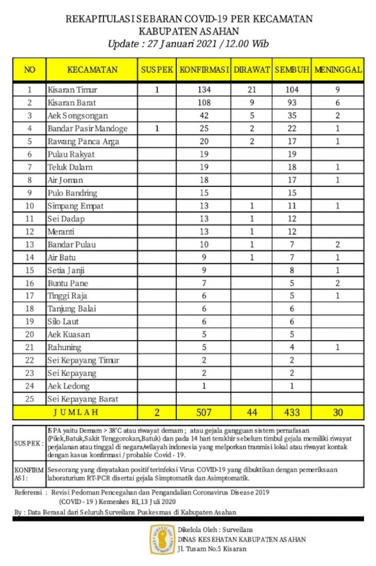 Demikian Data Update tersebut disampaikan Juru Bicara Satuan Tugas Percepatan Penanganan Covid – 19 Kabupaten Asahan H. Rahmat Hidayat Siregar S. Sos. M.Si, Rabu (27/01/2021) berdasarkan hasil data surveilans dari seluruh Puskesmas yang ada di wilayah Kabupaten Asahan sebagaimana di kelola Dinas Kesehatan Kabupaten Asahan pertanggal 27 Januari 2021 hingga pukul 12.00 Wib.