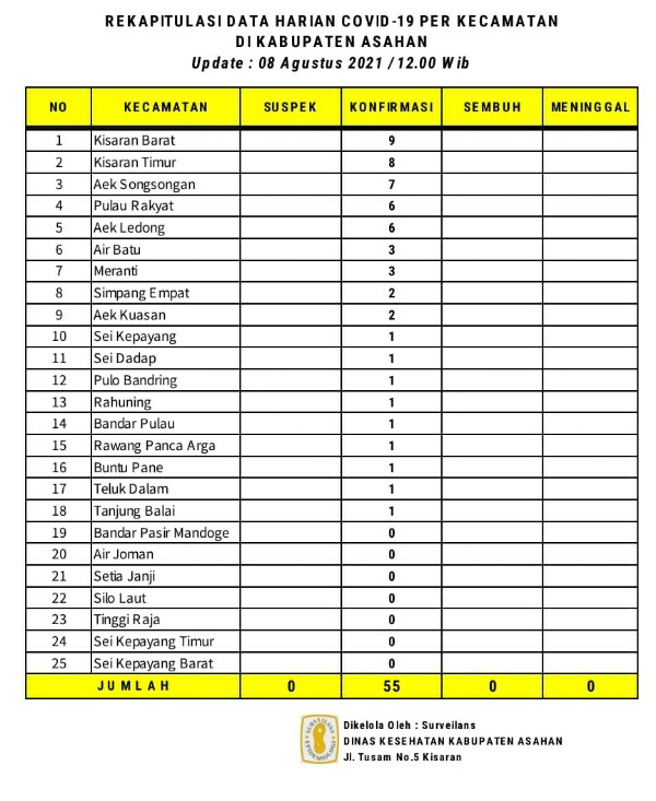 EKSISNEWS.COM, Kisaran – Rekapitulasi Harian Covid – 19 per Kecamatan untuk hari ini sebagaimana data surveilans dari seluruh Puskesmas yang ada di wilayah Kabupaten Asahan yang di kelola Dinas Kesehatan Kabupaten Asahan tanggal 08 Agustus 2021 pukul 12.00 Wib warga Asahan yang Konfirmas sebanyak 55 orang akibat Covid – 19.