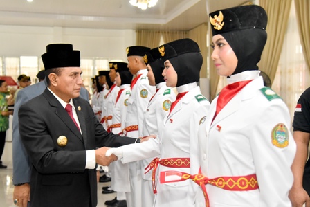 MEDAN, Eksisnews.com – Berseragam putih, 66 anggota Pasukan Pengibar Bendera Pusaka (Paskibraka) Provinsi Sumatera Utara (Provsu) tahun 2019, bersemangat memasuki Aula Rumah Dinas Gubernur Sumut, Jalan Jenderal Sudirman, Nomor 41 Medan, Kamis (15/8/2019). Gembira dan bahagia terpancar di wajah mereka ketika dikukuhkan oleh Gubernur Sumut Edy Rahmayadi menjadi Paskibraka 2019 dalam upacara pengukuhan.
