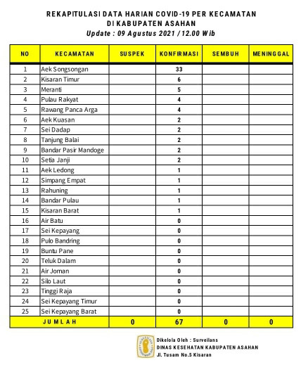 EKSISNEWS.COM, Kisaran – Rekapitulasi Harian Covid – 19 per Kecamatan untuk hari ini sebagaimana data surveilans dari seluruh Puskesmas yang ada di wilayah Kabupaten Asahan yang di kelola Dinas Kesehatan Kabupaten Asahan tanggal 09 Agustus 2021 pukul 12.00 Wib warga Asahan yang Konfirmas sebanyak 67 orang akibat Covid – 19.