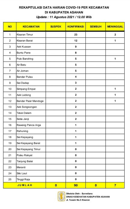 EKSISNEWS.COM, Kisaran – Rekapitulasi Harian Covid – 19 per Kecamatan untuk hari ini sebagaimana data surveilans dari seluruh Puskesmas yang ada di wilayah Kabupaten Asahan yang di kelola Dinas Kesehatan Kabupaten Asahan tanggal 11 Agustus 2021 pukul 12.00 Wib warga Asahan yang Konfirmas sebanyak 90 orang dan 7 orang Meninggal dunia akibat Covid – 19.