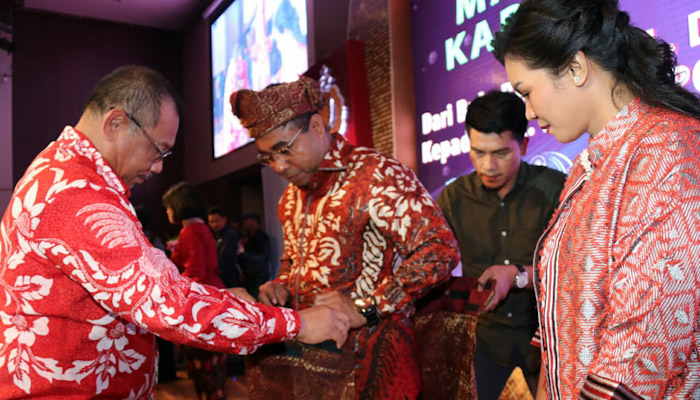 Penyerahan cindera mata dan pemakaian tengkulok dan Songket Deli tersebut dilakukan Plt Wali Kota dalam acara Malam pisah sambut Kapolrestabes Medan dari Brigjen Pol Dr Dadang Hartanto SH SIK MSi kepada Kombes Pol Jhonny Edison Isir SIK MTCP di Ballroom Hotel Grand Aston Medan, Sabtu (4/1). Brigjen Pol Dadang selanjutnya akan menempati jabatan baru sebagai Karorenmin Bareskrim Polri.