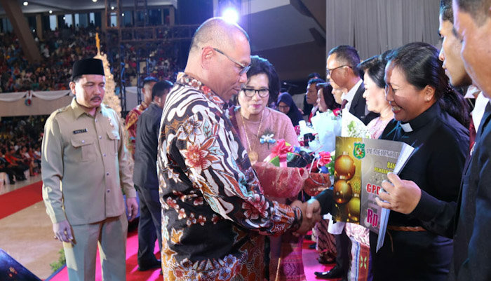 MEDAN, Eksisnews.com – Mars Kota Medan mengumandang di Pardede Hall menyambut kedatangan Pelaksana tugas (Plt) Wali Kota Medan Ir H Akhyar Nasution MSi ketika menghadiri puncak perayaan Natal Oikumene Kota Medan 2019, Selasa (10/12). Perayaan yang digelar untuk memperingati hari kelahiran Jesus Kristus itu dihadiri ribuan umat Kristiani yang datang dari seluruh penjuru Kota Medan. Selain ibadah, perayaan juga diisi dengan hiburan dengan menghadirkan artis ibukota Judika Sihotang, Maria Calista dan Nabasa Trio.