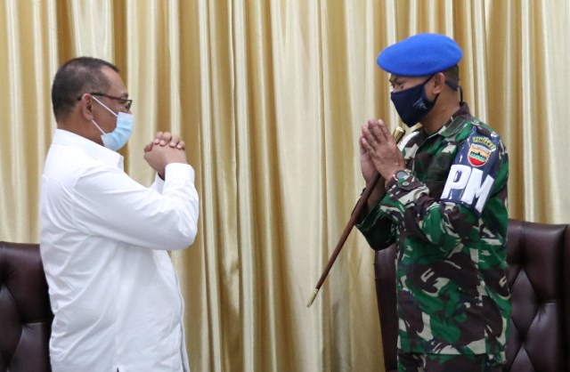 EKSISNEWS.COM, Medan – Dengan penuh keakraban, Pelaksana tugas (Plt) Wali Kota Medan Ir H Akhyar Nasution MSi menyambut kedatangan Komandan Detasemen Polisi Militer (Dandenpom) 1/5 BB Medan Letkol CPM Anggun Hendryantoro di Rumah Dinas Wali Kota, Jalan Sudirman Medan, Rabu (29/7).