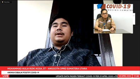 Berbagi kisah, Aulia menceritakan pengalaman dan hikmah yang ia peroleh selama menjalani perawatan, Kamis (30/4/2020), melalui konferensi video secara live pada Media Center Gugus Tugas Percepatan Penanganan (GTPP) Covid-19 Provinsi Sumut, Kantor Gubsu Jalan Diponegoro Nomor 30 Medan. Dialog dipandu oleh Jubir GTPP Covid-19 Sumut, Aris Yudhariansyah.