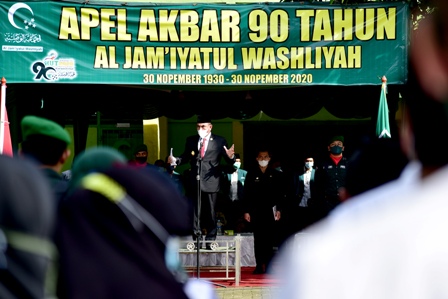 EKSISNEWS.COM, Medan – Gubernur Sumatera Utara (Gubsu) Edy Rahmayadi menjadi inspektur upacara Apel Akbar 90 Tahun Al Jam’iyatul Washliyah, Senin (30/11/2020), di Lapangan Upacara Universitas Al Washliyah (UNIVA) Medan, Jalan Sisingamangaraja Medan. Diharapkan Al Washliyah terutama para generasi mudanya terus mengisi kemerdekaan, khususnya berkontribusi bagi bangsa dan negara.
