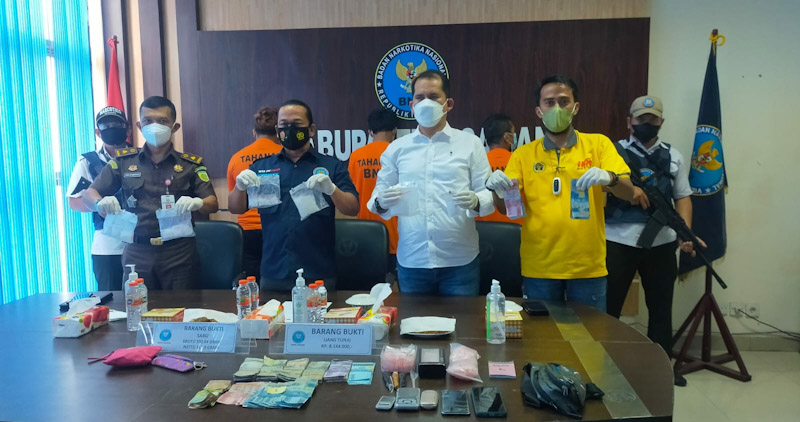 EKSISNEWS.COM, Kisaran – Kepala BNNK Asahan, Kompol Rohim Marthin Gultom, dalam paparannya menjelaskan penangkapan dilakukan pada 3 November 2021 pukul 01.00 WIB. Pihaknya menangkap 3 tersangka yang diduga penjual narkoba disebuah rumah keluarga Ttersangka dan mengamankan barang bukti narkoba jenis sabu netto 317,9 gram, uang Rp 8 Juta lebih, alat timbangan, sekop, plastik klip berbagai ukuran dan HP.