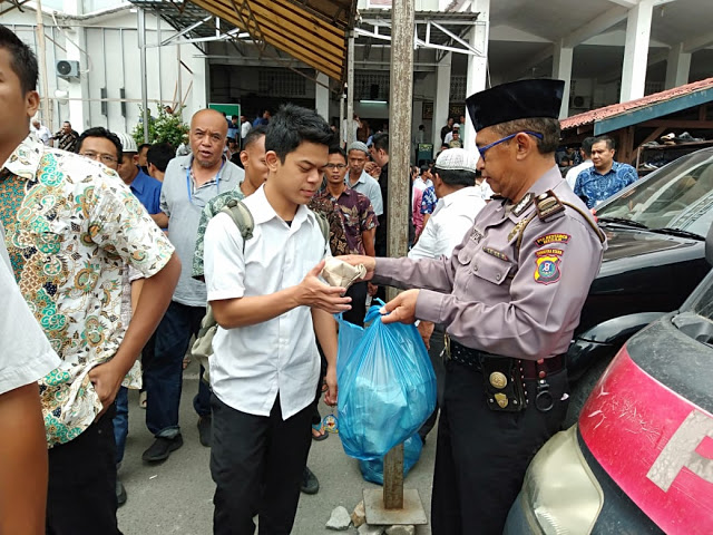 Kegiatan Jumat Barokah diman Kapolsek Medan Baru Kompol Martuasah H. Tobing, SH SIK MH, berbagi nasi sebanyak 100 bungkus kepada warga di depan Masjid Agung Jalan Dipenogoro Medan, Jumat (22/11/2019) siang.