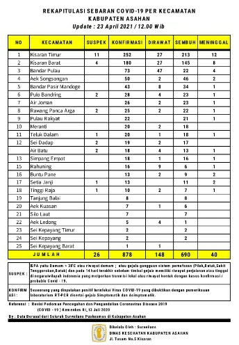Demikian Data Update tersebut disampaikan Juru Bicara Satuan Tugas Percepatan Penanganan Covid – 19 Kabupaten Asahan H. Rahmat Hidayat Siregar S. Sos. M.Si, Jumat (23/04/2021) berdasarkan hasil data surveilans dari seluruh Puskesmas yang ada di wilayah Kabupaten Asahan sebagaimana di kelola Dinas Kesehatan Kabupaten Asahan pertanggal 23 April 2021 hingga pukul 12.00 Wib.