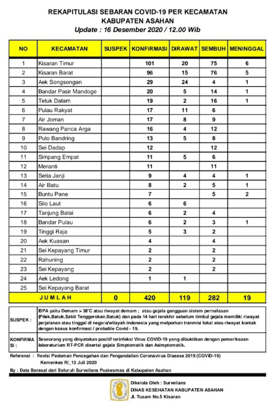 Demikian Data Update tersebut disampaikan Juru Bicara Gugus Tugas Percepatan Penanganan Covid – 19 Kabupaten Asahan H. Rahmat Hidayat Siregar S. Sos. M.Si, berdasarkan hasil data surveilans dari seluruh Puskesmas yang ada di wilayah Kabupaten Asahan sebagaimana di kelola Dinas Kesehatan Kabupaten Asahan pertanggal 16 Desember 2020 hingga pukul 12.00 Wib, Rabu (16/12/2020) melalui group WhatsApp.