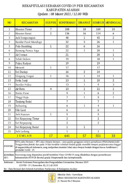 Demikian Data Update tersebut disampaikan Juru Bicara Satuan Tugas Percepatan Penanganan Covid – 19 Kabupaten Asahan H. Rahmat Hidayat Siregar S. Sos. M.Si, Senin (08/03/2021) berdasarkan hasil data surveilans dari seluruh Puskesmas yang ada di wilayah Kabupaten Asahan sebagaimana di kelola Dinas Kesehatan Kabupaten Asahan pertanggal 08 Maret 2021 hingga pukul 12.00 Wib.