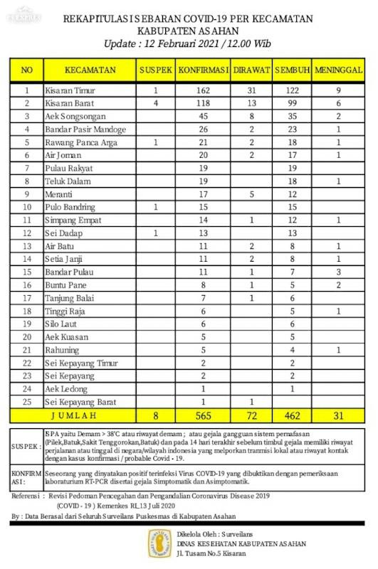 Dari 565 orang warga Asahan yang Konfirmasi ada sebanyak 72 orang dalam perawatan, 462 orang telah dinyatakan sembuh dan 31 orang meninggal dunia serta ada 8 warga yang Suspek. Demikian Data Update tersebut disampaikan Juru Bicara Satuan Tugas Percepatan Penanganan Covid – 19 Kabupaten Asahan H. Rahmat Hidayat Siregar S. Sos. M.Si, Jumat (12/02/2021) berdasarkan hasil data surveilans dari seluruh Puskesmas yang ada di wilayah Kabupaten Asahan sebagaimana di kelola Dinas Kesehatan Kabupaten Asahan pertanggal 12 Februari 2021 hingga pukul 12.00 Wib.