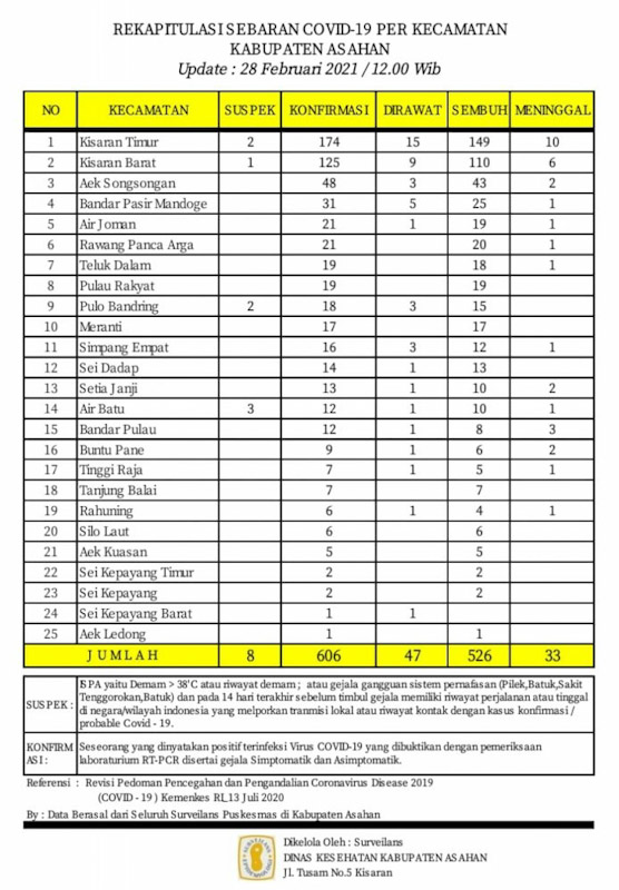 Demikian Data Update tersebut disampaikan Juru Bicara Satuan Tugas Percepatan Penanganan Covid – 19 Kabupaten Asahan H. Rahmat Hidayat Siregar S. Sos. M.Si, Minggu (28/02/2021) berdasarkan hasil data surveilans dari seluruh Puskesmas yang ada di wilayah Kabupaten Asahan sebagaimana di kelola Dinas Kesehatan Kabupaten Asahan pertanggal 28 Februari 2021 hingga pukul 12.00 Wib.