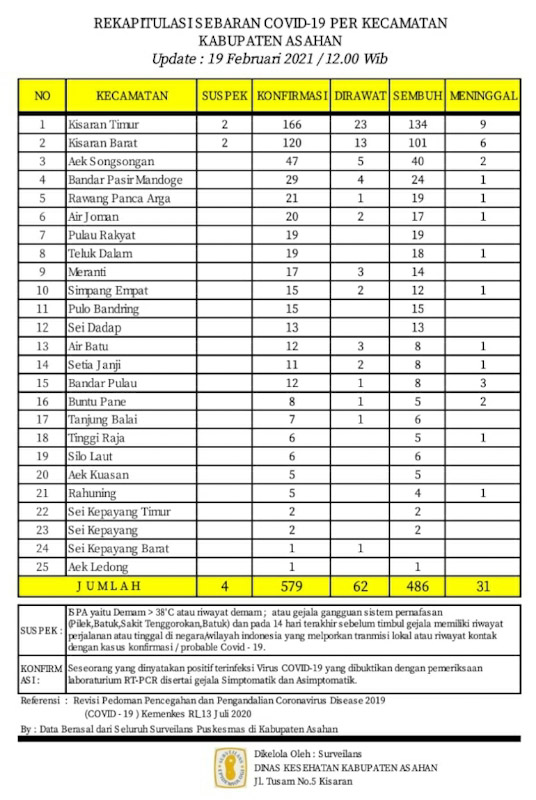 Dari 579 orang warga Asahan yang Konfirmasi ada sebanyak 62 orang dalam perawatan, 486 orang telah dinyatakan sembuh dan 31 orang meninggal dunia serta ada 4 warga yang Suspek. Demikian Data Update tersebut  disampaikan Juru Bicara Satuan Tugas Percepatan Penanganan Covid – 19 Kabupaten Asahan H. Rahmat Hidayat Siregar S. Sos. M.Si, Jumat (19/02/2021) berdasarkan hasil data surveilans dari seluruh Puskesmas yang ada di wilayah Kabupaten Asahan sebagaimana di kelola Dinas Kesehatan Kabupaten Asahan pertanggal 19 Februari 2021 hingga pukul 12.00 Wib.