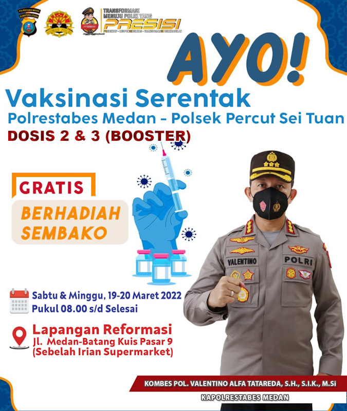 Vaksinasi dilaksanakan di Lapangan Reformasi, Jalan Medan-Batang Kuis Pasar 9 (Sebelah Irian Supermarket), Kecamatan Percut Sei Tuan, Sabtu dan Minggu, 19-20 Maret 2022.