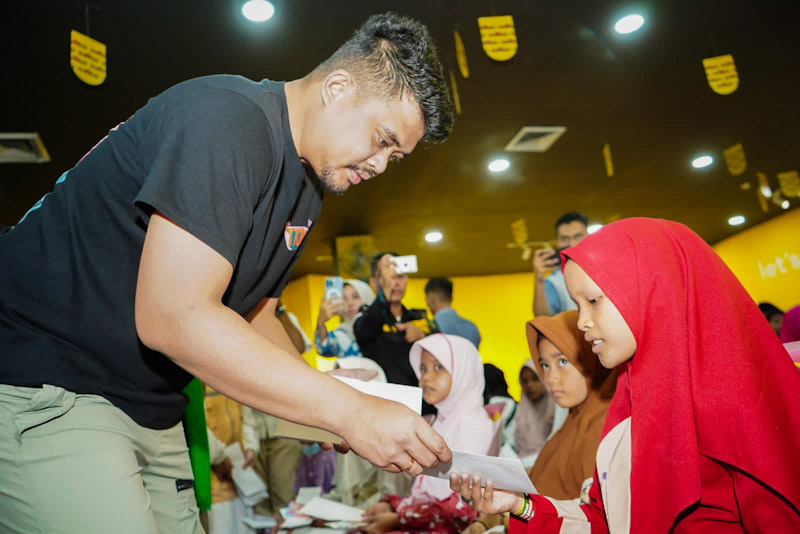 EKSISNEWS.COM, Medan – Wajah seratus anak yatim dhuafa Kota Medan terlihat sangat ceria. Senyum sumringah tanda penuh kebahagian terus terpancar dari wajah polos mereka. Tangan kecil mereka tampak menggenggam erat voucher belanja senilai Rp.500.000 dan voucer bermain. Wajah mereka semakin ceria lagi ketika Wali Kota Medan Bobby Nasution datang dan memberikan tambahan Rp 200.000 untuk setiap anak.