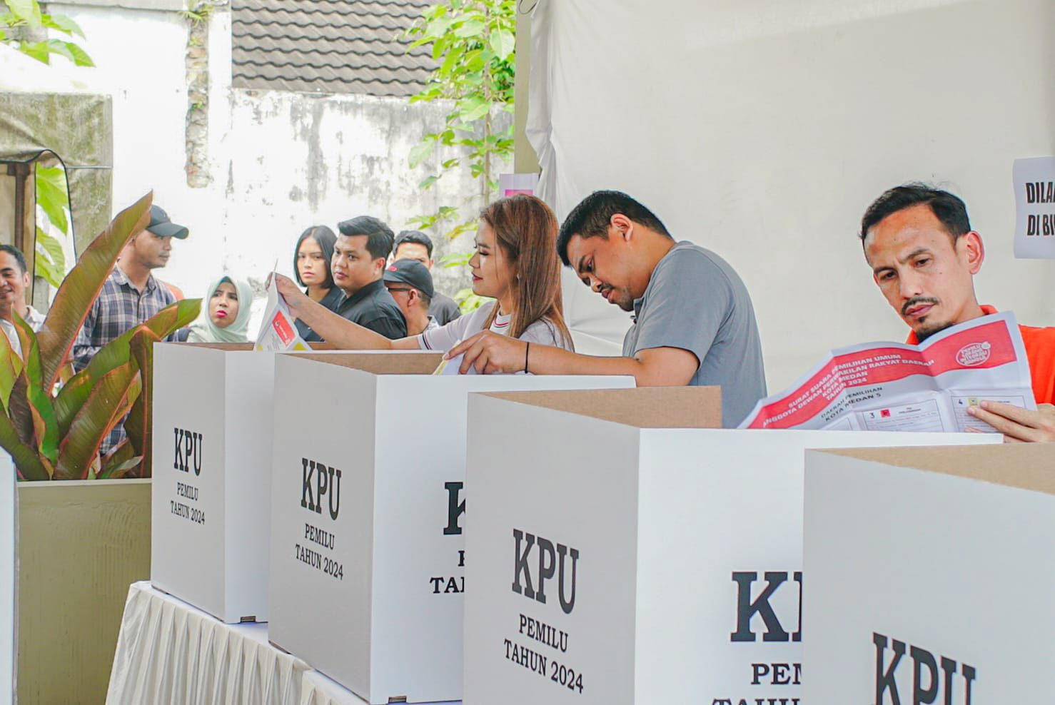 EKSISNEWS.COM, Medan – Wali Kota Medan, Bobby Nasution, bersama Ketua TP PKK Kota Medan Kahiyang Ayu Bobby Nasution, menggunakan hak suaranya untuk Pemilihan Presiden (Pilpres) pada Pemilihan Umum atau Pemilu 2024. Orang nomor satu di Pemko Medan tersebut mencoblos di Tempat Pemungutan Suara (TPS) 34, Tasbi, Blok VV, Kelurahan Asam Kumbang, Kecamatan Medan Selayang, Rabu (14/2/2024).