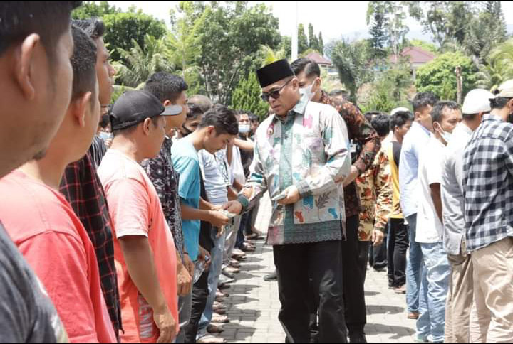 EKSISNEWS.COM, Panyabungan – Bupati Mandailing Natal (Madina) HM Jafar Sukhairi kembali membagikan gaji pokoknya sebagai bupati. Kali ini yang menerima gaji tersebut 68 sopir angkutan kota (angkot) di halaman Masjid Agung Nur Ala Nur, Desa Parbangunan, Kecamatan Panyabungan, Kamis (31/3/2022).