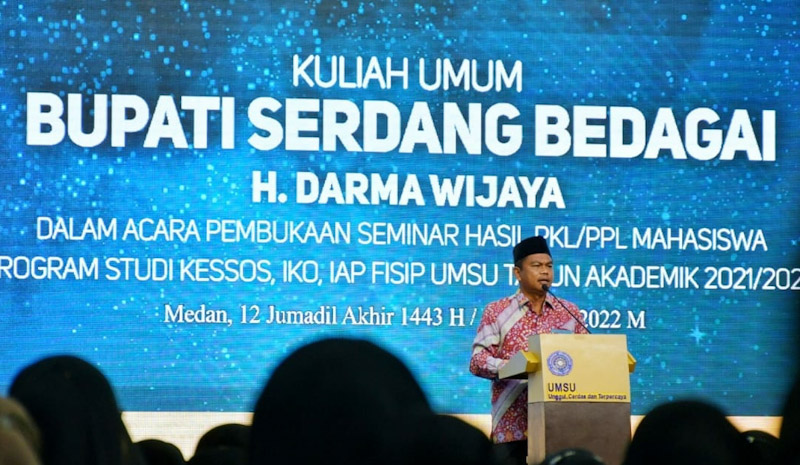 EKSISNEWS.COM, Medan – Bupati Serdang Bedagai (Sergai) menyampaikan kuliah umum memberikan motivasi kepada para mahasiswa di kampus utama Universitas Muhammadiyah Sumatera Utara (UMSU)  Jalan Mukhtar Basri Medan, pada Sabtu, (15/1/2022).