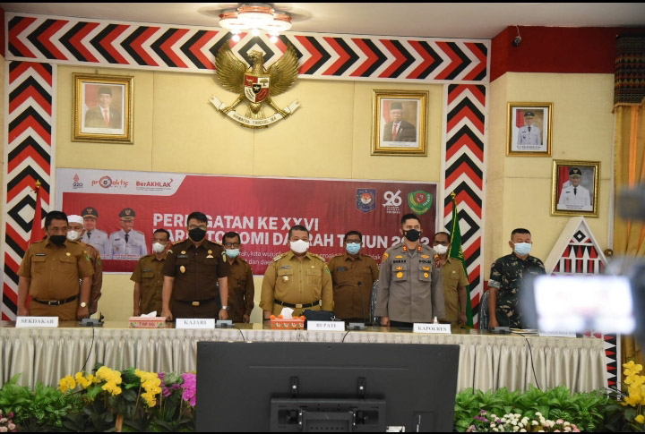 EKSISNEWS.COM, Tapsel – Bupati Tapanuli Selatan (Tapsel) H. Dolly Pasaribu, SPt, MM, bersama jajaran Forkopimda Kabupaten Tapanuli Selatan menghadiri peringatan Hari Otonomi Daerah ke XXVI Tahun 2022 yang digelar secara virtual di Aula Sarasi, Lantai III, Kantor Bupati Tapsel, Senin (25/4/22).