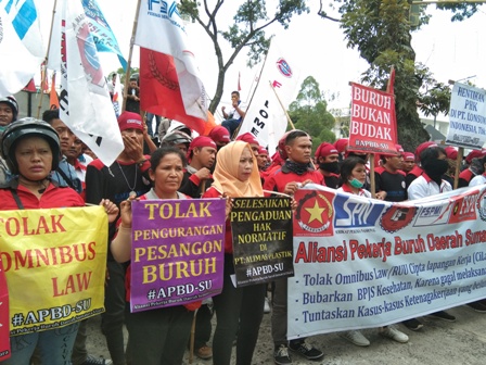 “Omnibus Law itu sedang digodok pemerintah dengan tujuan dilatar belakangi masuknya investor. Keberadaan investor itu sejatinya buat kesejahteraan buruh, tapi kalau tetaplah dibuat kita miskin untuk apa, lebih baik ditolak,” tegas koordinator aksi APBD-SU dihadapan massa yang sebagian besar membawa spanduk dan poster.
