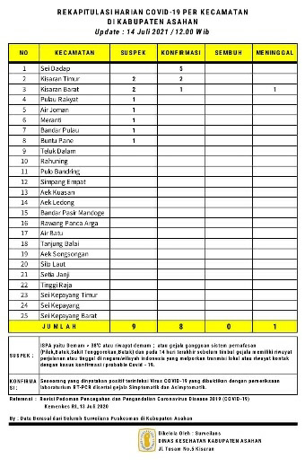 Lebih lanjut dikatakannya dimana data sebelumnya pada tanggal 13 Juli 2021 Rekapitulasi Harian Covid – 19 per Kecamatan di Asahan dengan jumlah 9 warga Asahan Suspek, 9 Konfirmasi, 5 Sembuh dan 2 Meninggal dunia akibat Covid.