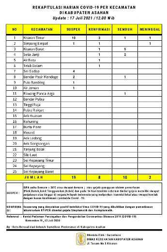 EKSISNEWS.COM, Kisaran – Rekapitulasi Harian Covid – 19 per Kecamatan untuk hari ini sebagaimana data surveilans dari seluruh Puskesmas yang ada di wilayah Kabupaten Asahan yang di kelola Dinas Kesehatan Kabupaten Asahan tanggal 17 Juli 2021 pukul 12.00 Wib ada 19 warga Asahan Suspek, 8 Konfirmasi, 10 Sembuh dan 2 orang meninggal dunia akibat Covid – 19.