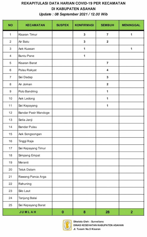 Lebih lanjut dikatakannya dimana untuk data hari ini Kecamatan Kisaran Timur mendominasi Konfirmasi tertinggi sebanyak 3 orang disusul warga Kecamatan Air Batu sebanyak 3 orang. Dayat juga menyampaikan dimana data sebelumnya pada tanggal 07 September 2021 Rekapitulasi Harian Covid–19 per Kecamatan di Asahan dengan jumlah warga Asahan yang Konfirmas sebanyak 17 orang 24 orang dinyatakan Sembuh dan 2 orang Meninggal dunia akibat Covid.