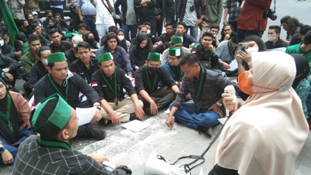 “Sudah banyak problematika bahwasannya rezim Jokowi gagal, rakyat banyak yang menjerit yang katanya indonesia tanah airku nyatanya tanah air ku di beli,” teriak koordinator lapangan dari aksi mahasiswa HMI.