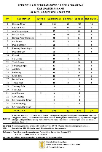 Demikian Data Update tersebut disampaikan Juru Bicara Satuan Tugas Percepatan Penanganan Covid – 19 Kabupaten Asahan H. Rahmat Hidayat Siregar S. Sos. M.Si, Rabu (14/04/2021) berdasarkan hasil data surveilans dari seluruh Puskesmas yang ada di wilayah Kabupaten Asahan sebagaimana di kelola Dinas Kesehatan Kabupaten Asahan pertanggal 14 April 2021 hingga pukul 12.00 Wib.