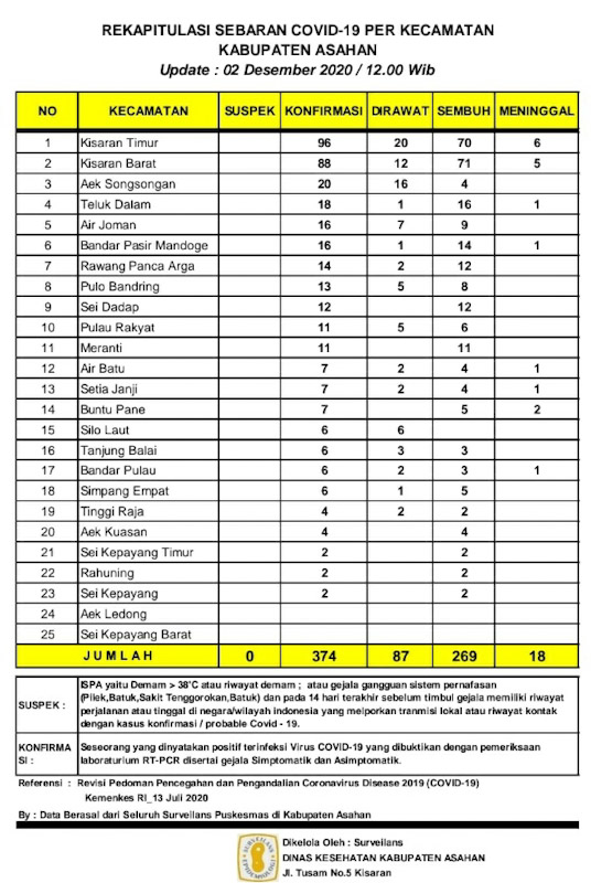 Demikian Data Update tersebut disampaikan Juru Bicara Gugus Tugas Percepatan Penanganan Covid – 19 Kabupaten Asahan H. Rahmat Hidayat Siregar S. Sos. M.Si, berdasarkan hasil data surveilans dari seluruh Puskesmas yang ada di wilayah Kabupaten Asahan sebagaimana di kelola Dinas Kesehatan Kabupaten Asahan pertanggal 02 Desember 2020 hingga pukul 12.00 Wib, Rabu (02/12/2020) melalui group WhatsApp.