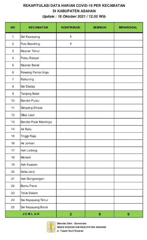 EKSISNEWS.COM, Asahan – Rekapitulasi Harian Covid – 19 per Kecamatan untuk hari ini sebagaimana data surveilans dari seluruh Puskesmas di wilayah Kabupaten Asahan yang di kelola Dinas Kesehatan Kabupaten Asahan pertanggal 16 Oktober 2021 hingga pukul 12.00 Wib, Ada 2 orang warga di Asahan yang terkonfirmasi positif, tifak ada yang dinyatakan sembuh dan tidak ada juga yang meninggal dunia. Demikian hal tersebut di sampaikan Jurubicara Satuan Tugas Percepatan Penanganan Covid-19 Kabupaten Asahan H. Rahmat Hidayat Siregar S. Sos, Msi kepada wartawan, Sabtu (16/10/2021).