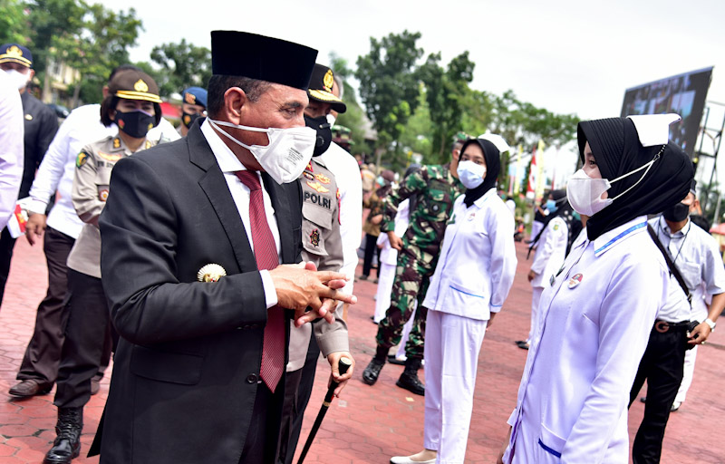 “Dari bulan Januari 2021 kita sudah melakukan vaksinasi dan sampai saat ini terus berlangsung, tetapi butuh percepatan dan perluasan, karena itu kita butuh tenaga tambahan,” kata Gubernur Sumut Edy Rahmayadi, usai Apel Kesiapan Vaksinator Tambahan dalam Rangka Percepatan Pelaksanaan Vaksinasi di Wilayah Provinsi Sumut di Halaman Mapolda Sumut, Jalan Sisingamangaraja Km. 10,5, Medan, Sabtu (10/7/2021).