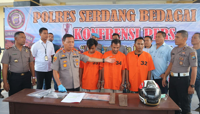 Kapolres AKBP Robin Simatupang mengungkapkan Sat Reskrim telah berhasil meringkus 4 tersangka berikut barang bukti yang dilakukan saat menjalankan aksinya, tepat pada hari Selasa (21/01/2020) sekira jam 18.00 Wib tepatnya di Kampung Silalahi Desa Blok 9 Kecamatan Dolok Masihul Kabupaten Serdang Bedagai.