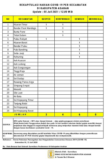 Lebih lanjut dikatakannya dimana data sebelumnya pada tanggal 04 Juli 2021 Rekapitulasi Harian Covid – 19 per Kecamatan di Asahan dengan jumlah 3 warga Asahan Suspek, 5 Konfirmasi, 6 Sembuh dan 1 Meninggal akibat Covid.