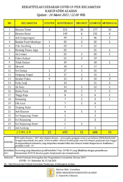 Demikian Data Update tersebut disampaikan Juru Bicara Satuan Tugas Percepatan Penanganan Covid – 19 Kabupaten Asahan H. Rahmat Hidayat Siregar S. Sos. M.Si, Rabu (24/03/2021) berdasarkan hasil data surveilans dari seluruh Puskesmas yang ada di wilayah Kabupaten Asahan sebagaimana di kelola Dinas Kesehatan Kabupaten Asahan pertanggal 24 Maret 2021 hingga pukul 12.00 Wib.