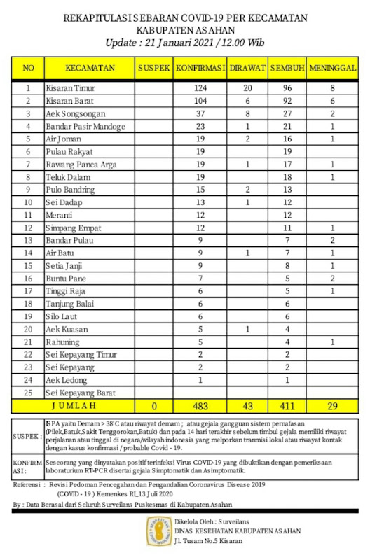 Demikian Data Update tersebut disampaikan Juru Bicara Satuan Tugas Percepatan Penanganan Covid – 19 Kabupaten Asahan H. Rahmat Hidayat Siregar S. Sos. M.Si, Kamis, (21/01/2021) berdasarkan hasil data surveilans dari seluruh Puskesmas yang ada di wilayah Kabupaten Asahan sebagaimana di kelola Dinas Kesehatan Kabupaten Asahan pertanggal 21 Januari 2021 hingga pukul 12.00 Wib.