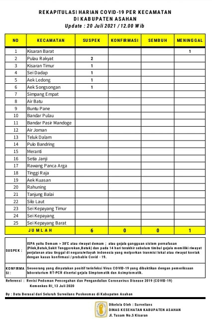 EKSISNEWS.COM, Kisaran – Rekapitulasi Harian Covid – 19 per Kecamatan untuk hari ini sebagaimana data surveilans dari seluruh Puskesmas yang ada di wilayah Kabupaten Asahan yang di kelola Dinas Kesehatan Kabupaten Asahan tanggal 20 Juli 2021 pukul 12.00 Wib ada 6 warga Asahan Suspek dan 1 orang meninggal dunia akibat Covid – 19.