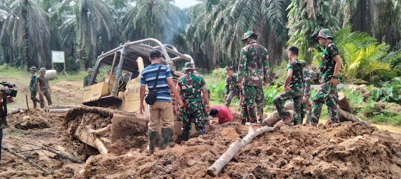 “Sambil menunggu bantuan alat berat untuk menarik bulldozer yang terperosok lumpur ini, kita kerahkan personil Satgas dibantu warga untuk melakukan evakuasi dengan memakai balok kayu sebagai bantalan,” jelas Kapten Erwin Harahap.